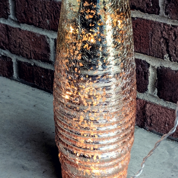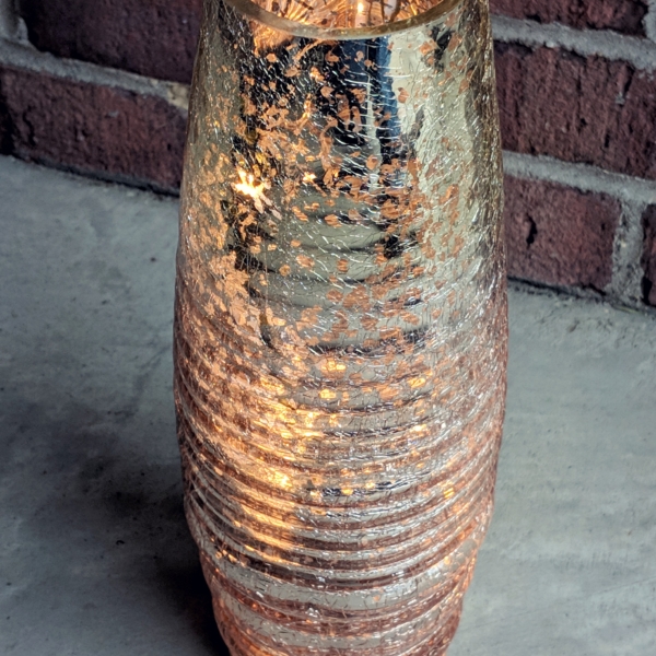 Light up a memory table or use these rose gold ombre pre lit mercury-look hurricanes as a stunning bar or head table accent. Dimensions: 11.75″ tall Color: Rose gold mercury look finish Available: 3